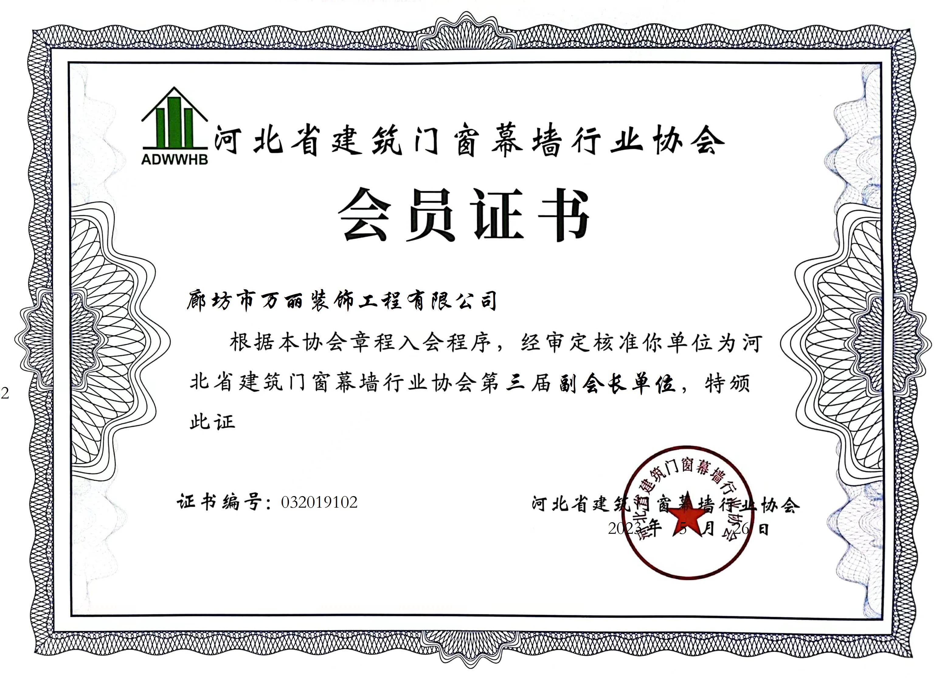 河北省建筑門窗幕墻行業(yè)協(xié)會會員證書